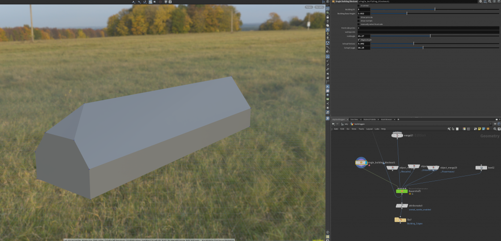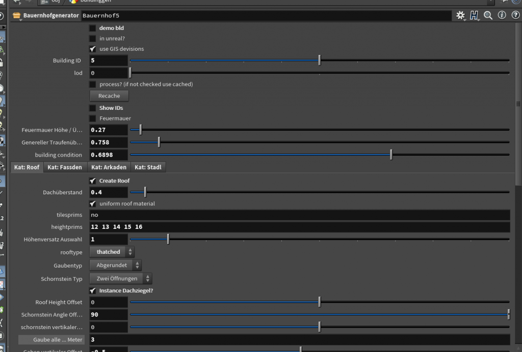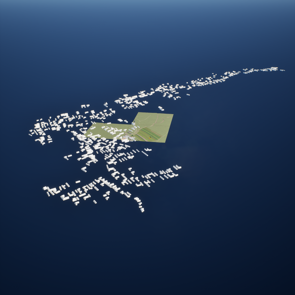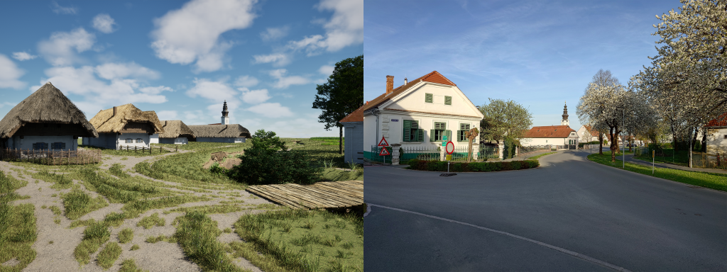 Technisch entsteht das Projekt als Echtzeitumgebung in „Unreal Engine“. Da Oberwart in dieser Zeit aus hunderten bäuerlichen Gebäuden bestand, wäre eine vollständige manuelle Modellierung mit den mir verfügbaren Ressourcen weder sinnvoll noch realistisch. Stattdessen entwickle ich einen prozeduralen Workflow: In QGIS werden zunächst Flächen, Baukörper und bauliche Eigenschaften segmentiert, anschließend werden diese Grundformen mit einem selbst erstellten Tool in unterschiedliche Gebäudetypen überführt. So lassen sich Dachformen, Materialien, Feuerwände, konstruktive Merkmale und weitere Eigenschaften parametrieren, ohne jede Struktur einzeln von Hand bauen zu müssen.