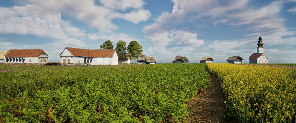 Für die Landschaft selbst versuche ich, nicht einfach generische Vegetation zu verwenden. Äcker, Uferzonen, Bäume und Wiesen sollen möglichst nah an der regionalen und historischen Realität liegen. Dafür fließen sowohl Vor-Ort-Recherche als auch historische Hinweise zu Pflanzen, Feldfrüchten und Nutzungsmustern ein. Mich interessiert dabei besonders, wie sehr sich die Wirkung eines Ortes verändert, sobald nicht nur die Häuser stimmen, sondern auch das Umfeld, in dem sie standen.